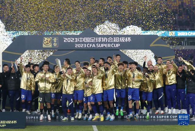 △4月8日,在2023中国足协超级杯比赛中,冠军武汉三镇队成员在颁奖仪式上庆祝。