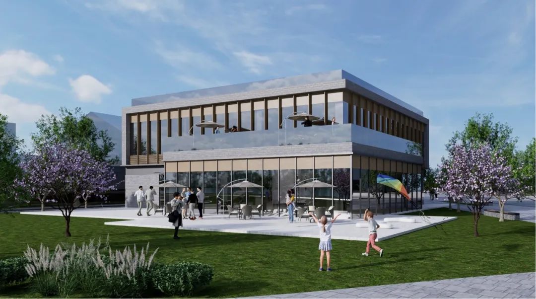 △茶文化轴线中部的文化舞台和中轴两侧的绿植墙体效果图。