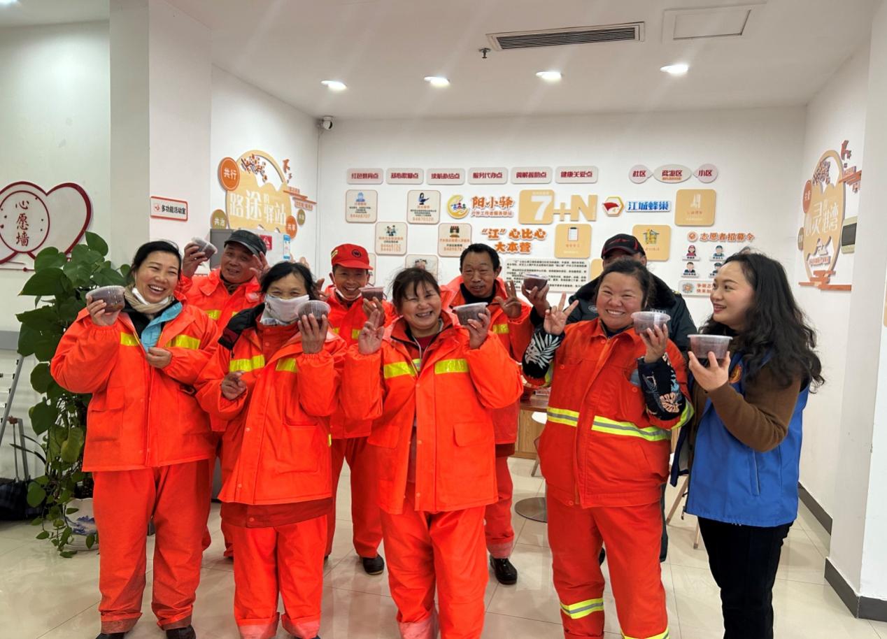 在社区阳小驿驿站,物业保洁员、安保员、环卫工人们围坐在一起,津津有味地品尝着这份暖意十足的美食。“在寒冷的天气里能喝上一碗软糯香甜的腊八粥,我们的心里也格外温暖。”环卫师傅张春芬端着粥开心地说道。