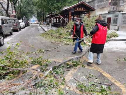 一大早,大家身穿红马甲拿着铁锹、笤帚,有条不紊地清理着辖区积雪以及被雨雪压断的树枝。同时考虑到独居老人出行不便,社区特地准备了“暖心菜”送货上门并仔细询问、了解老人身体状况。