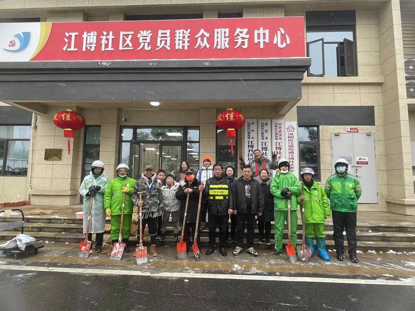 一晚的大雪给居民群众带了生活、出行上的诸多不便,2月4日上午,汉阳区江博社区组织辖区内企业单位、下沉党员及志愿者加入到清理积雪的队伍中,全力以赴保障道路安全畅通。