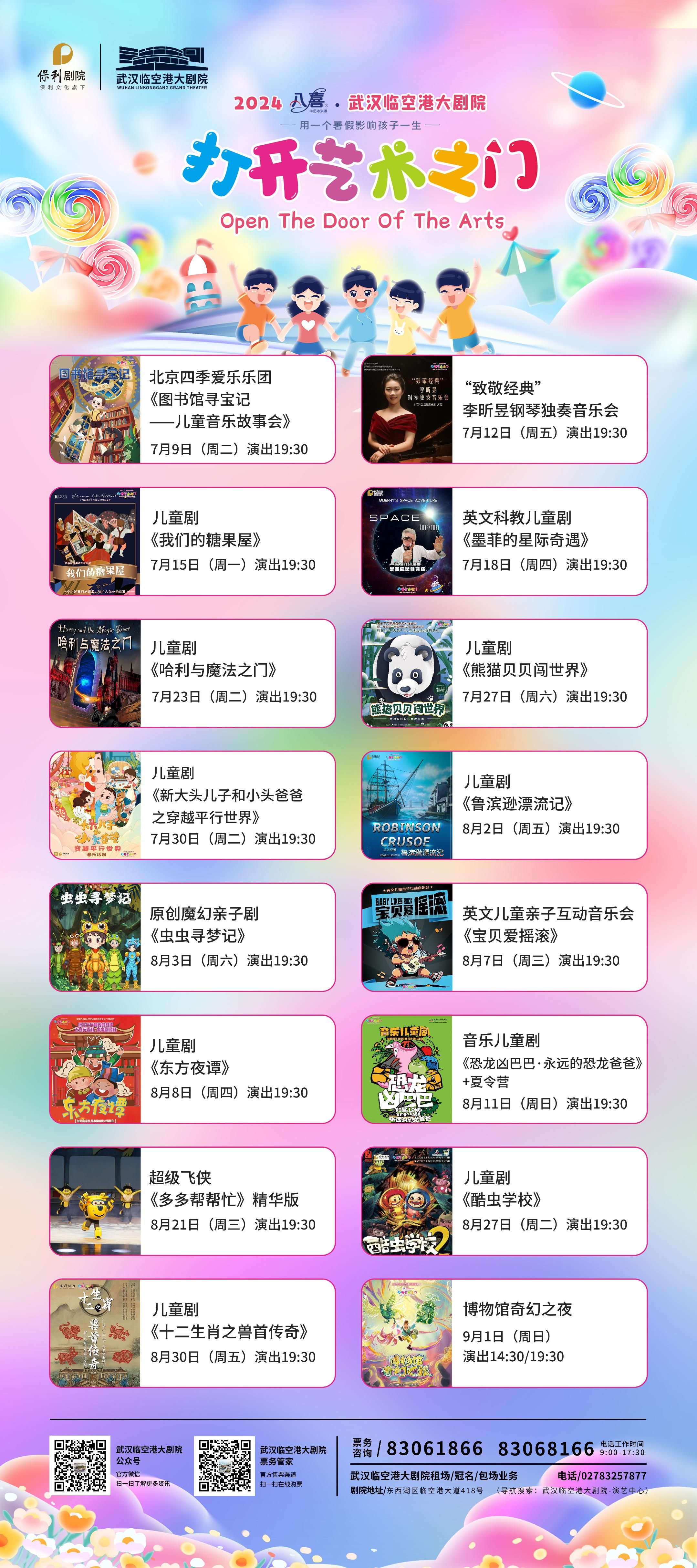 武汉临空港大剧院2024“打开艺术之门”暑期艺术节在7月9日-9月1日期间,共有 16个项目、17场演出,超级飞侠《多多帮帮忙》、英文儿童亲子互动音乐会《宝贝爱摇滚》等精彩演出将让青少年在充满奇幻、音乐与知识中度过夏日盛宴。