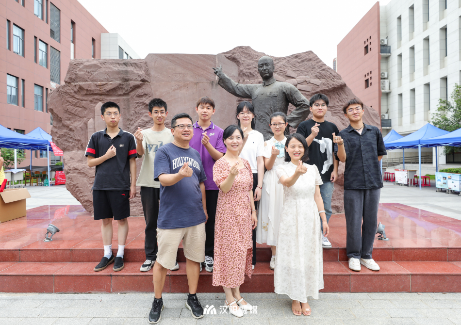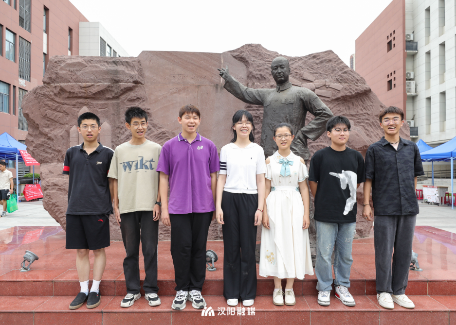 △部分高考总分690分以上学生在武汉三中校内钱学森雕像前合影。