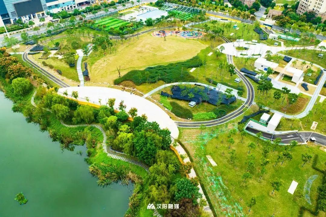 入园满眼尽是绿意,赏花观水两不误。园区由约4米宽的智慧跑道贯穿全域,更有五彩廊架、登山步道、滨水平台……是居民的静谧休闲好去处。