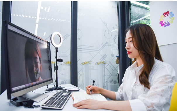 △入驻企业人资经理通过湖北武汉人力资源服务产业园汉阳园区的公共就业平台对求职者进行远程面试。