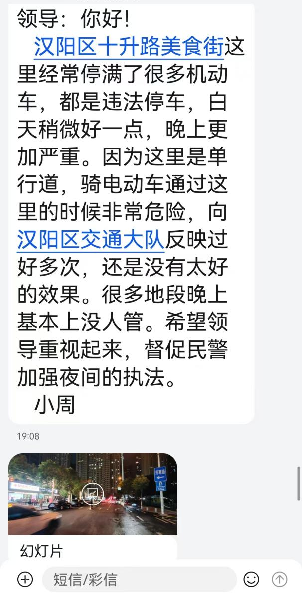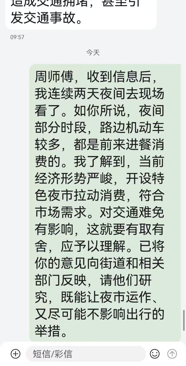8月底,居民周师傅通过民情民意联系点联系区人大代工委主任张梦君,向其反映十升路美食街存在夜间车辆乱停车问题。张主任连续两天夜间至十升路美食街现场调研,核实周师傅反馈问题属实后,立即将相关情况向琴断口街道人大工委反映。