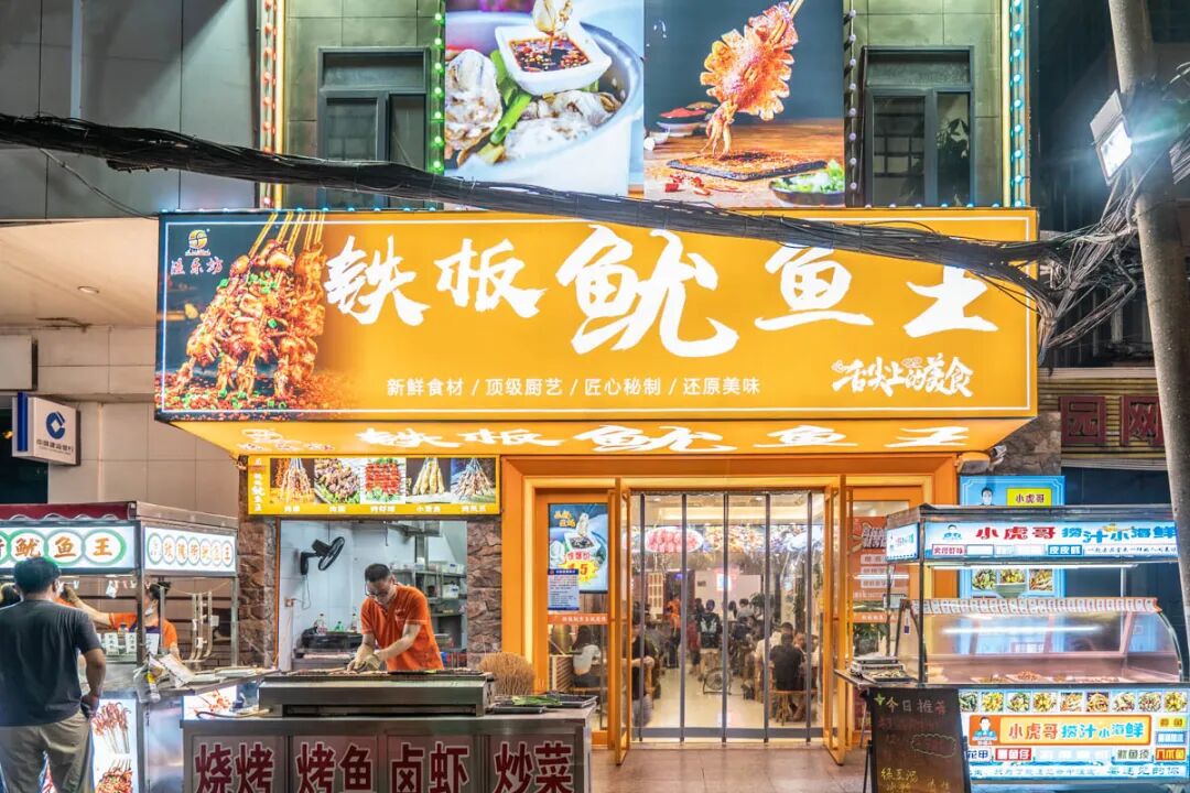 还有小朋友们最爱吃的铁板鱿鱼王,是街上的新晋流量担当。鱿鱼香味飘荡在整条街上,存在感极强。深海大鱿鱼个头饱满,自带大海的咸鲜口感;一元须沾满了独家酱汁和白芝麻,吃起来意犹未尽;鱿鱼粒更是颗颗Q弹,让人一口接一口的欲罢不能。