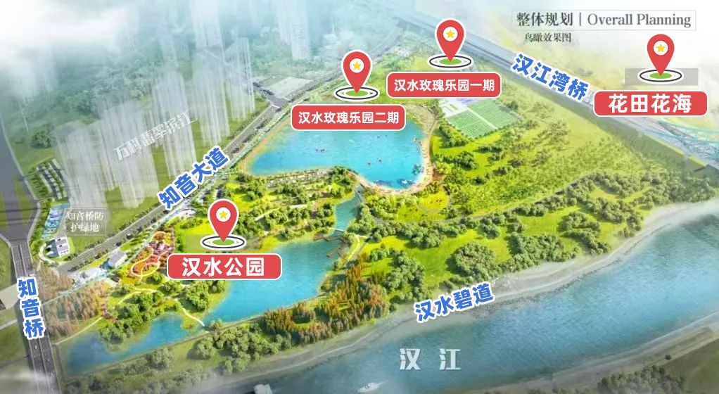 该区域以汉江为纽带,北朝汉江,南接知音大道,左右两侧分别为玉龙路(汉江湾桥)和龙阳大道(知音桥),规划总面积相较于汉水公园扩大了4倍。“整体规划设计围绕滨江品质生活做足文章,更加注重人居与自然的共睦。”园区相关负责人表示,汉水公园以生肖奇石、树桩盆景为特色,韵味独到;新建设的汉水玫瑰乐园集亲子潮玩于一体。两者串联成片,功能也更为丰富多样,带来更多不一样的游玩体验。