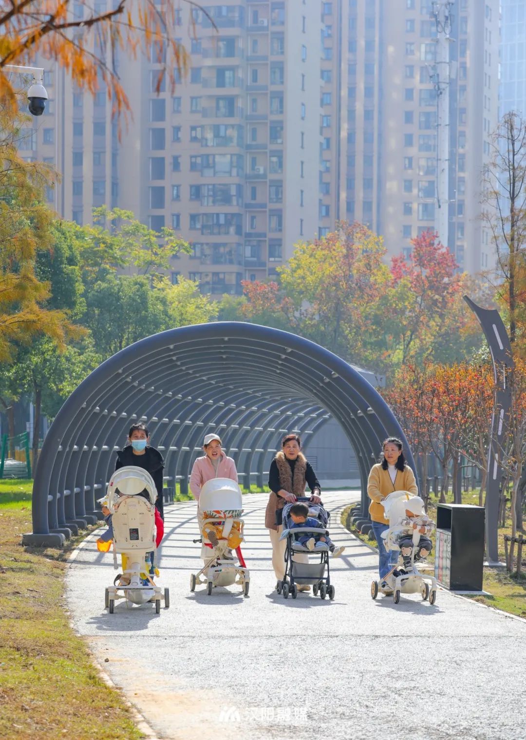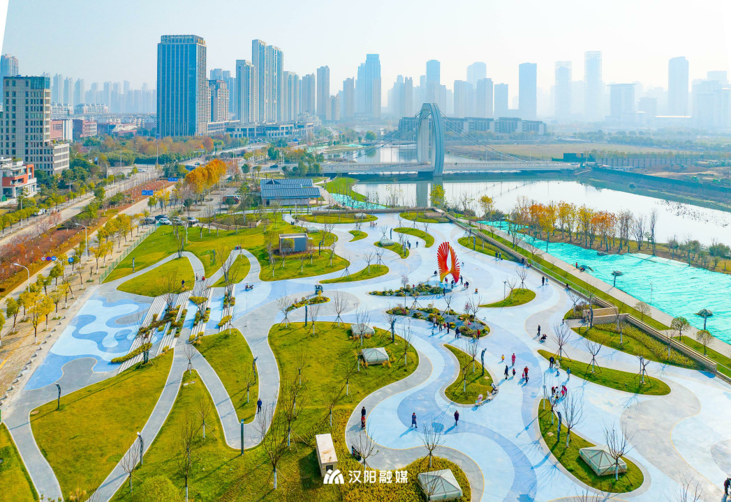 汉阳君在现场看到,新建的中央广场宽敞平坦,步道颜色鲜艳,在绮丽的景色中蜿蜒开来。靓红的凤凰雕塑在阳光下熠熠生辉,居民们三两成群地散步、拉家常,还有几名“舞者”,伴着韵律整齐划一,翩翩起舞。据了解,二期项目以“梧桐栖凤,花仙漫舞”为植物造景的设计思路,新栽植乔木320余株、地被约7300平方米、草坪约21000平方米等,并通过新建的5座桥梁,与一期连通,串联起6公里环水公园绿道,带来多样亲水体验。