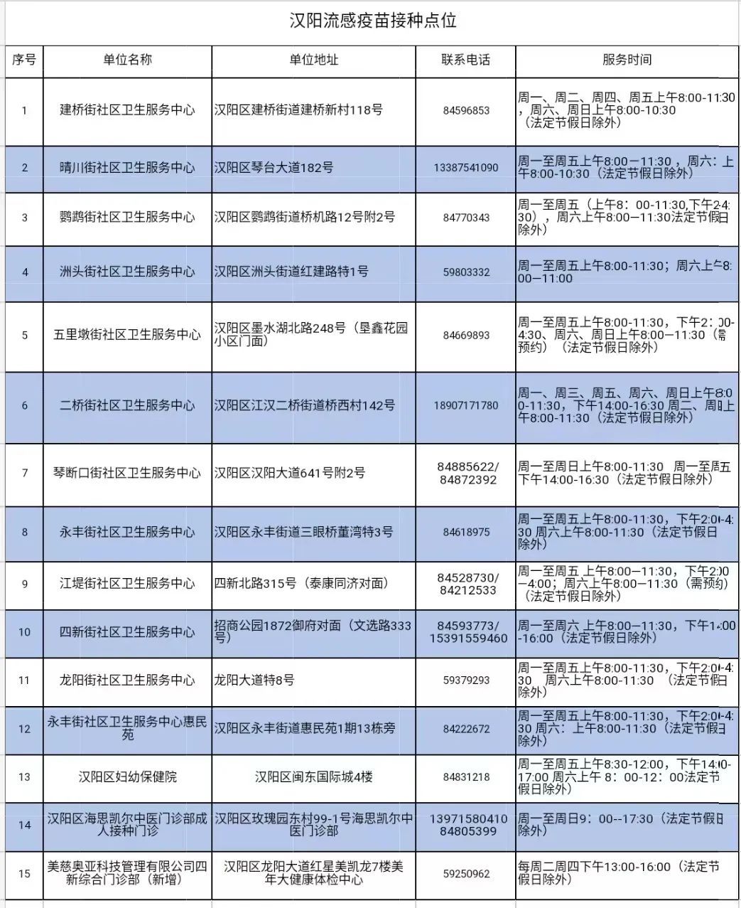 汉阳区15个接种点位