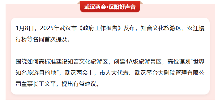 王文平代表表示,当前高品质文旅热潮持续升温,2025年武汉市《政府工作报告》提出,高标准建设知音文化旅游区,创建4A级旅游景区。这个决策顺应了市场需求和群众呼声!