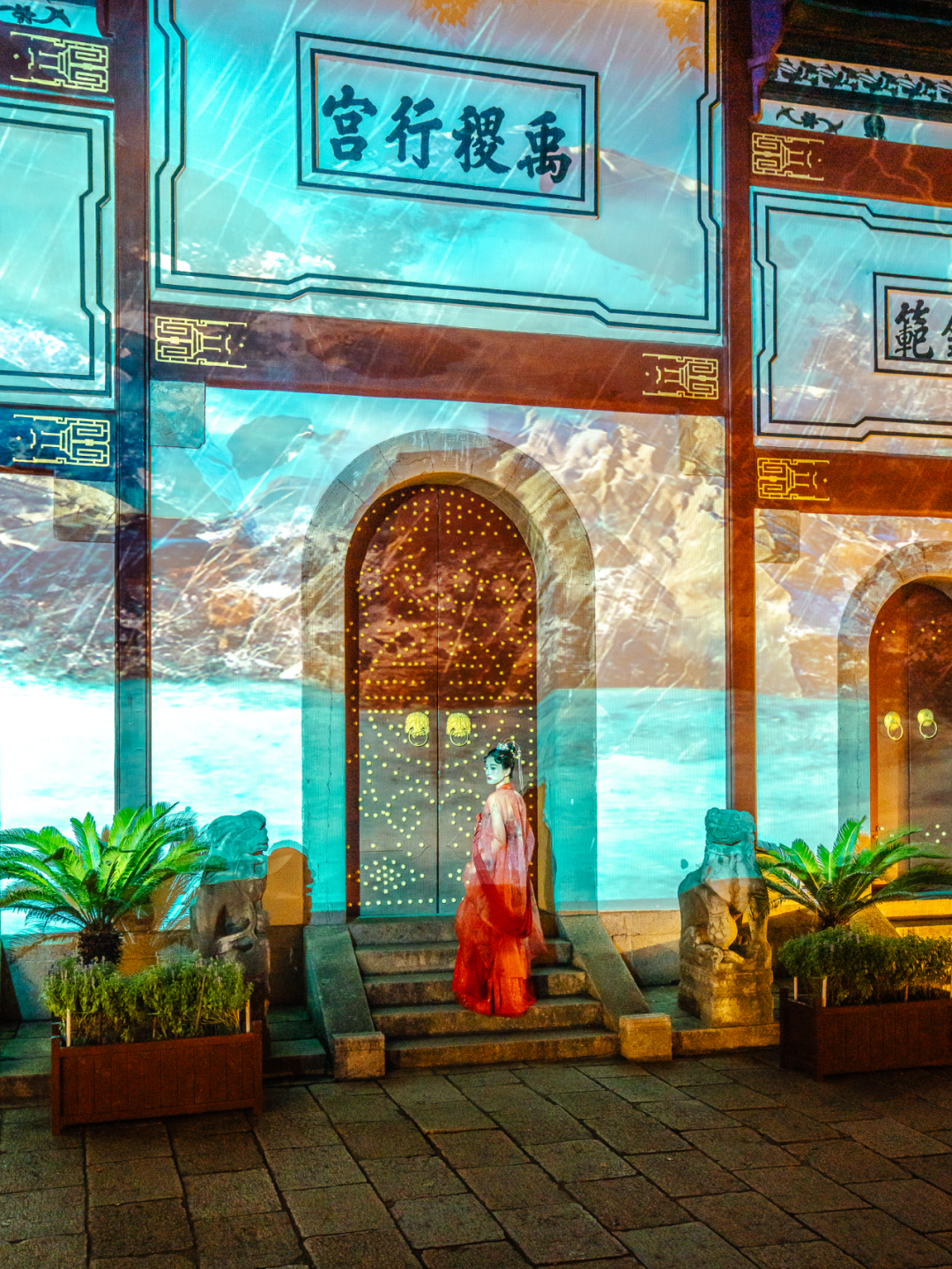 在晴川阁,春节期间,夜游晴川阁安排有《大禹晴川情》实景木偶剧、乐器独奏、古典舞、喷火、变脸、鱼灯舞、皮影戏等非遗表演。“诗韵月色”大禹文化周非遗市集设置了拓印、手工灯笼、猜灯谜等非遗民俗体验活动,以及传统手工艺品、特色小吃。还有“华彩霓裳,古韵新春”晴川阁新春汉服活动,让各地游客在汉阳逛归元庙会、赏晴川胜景、看大禹非遗。