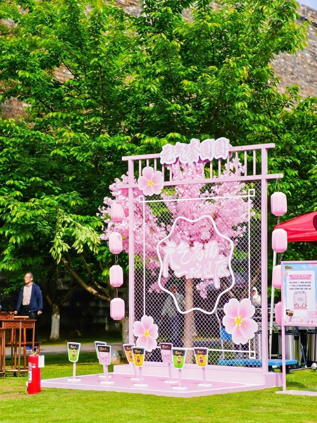 主会场设置樱花舞台,舞台由粉色环形地贴包裹,四周配合各式樱花打卡装置,氛围感拉满!