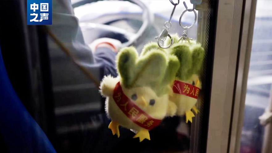 在湖北武汉603路公交驾驶室,玻璃门上挂着近期爆火的“蒜鸟”玩偶,“蒜鸟”身上还披着“为人民服务”的红色绶带,格外引人注目。