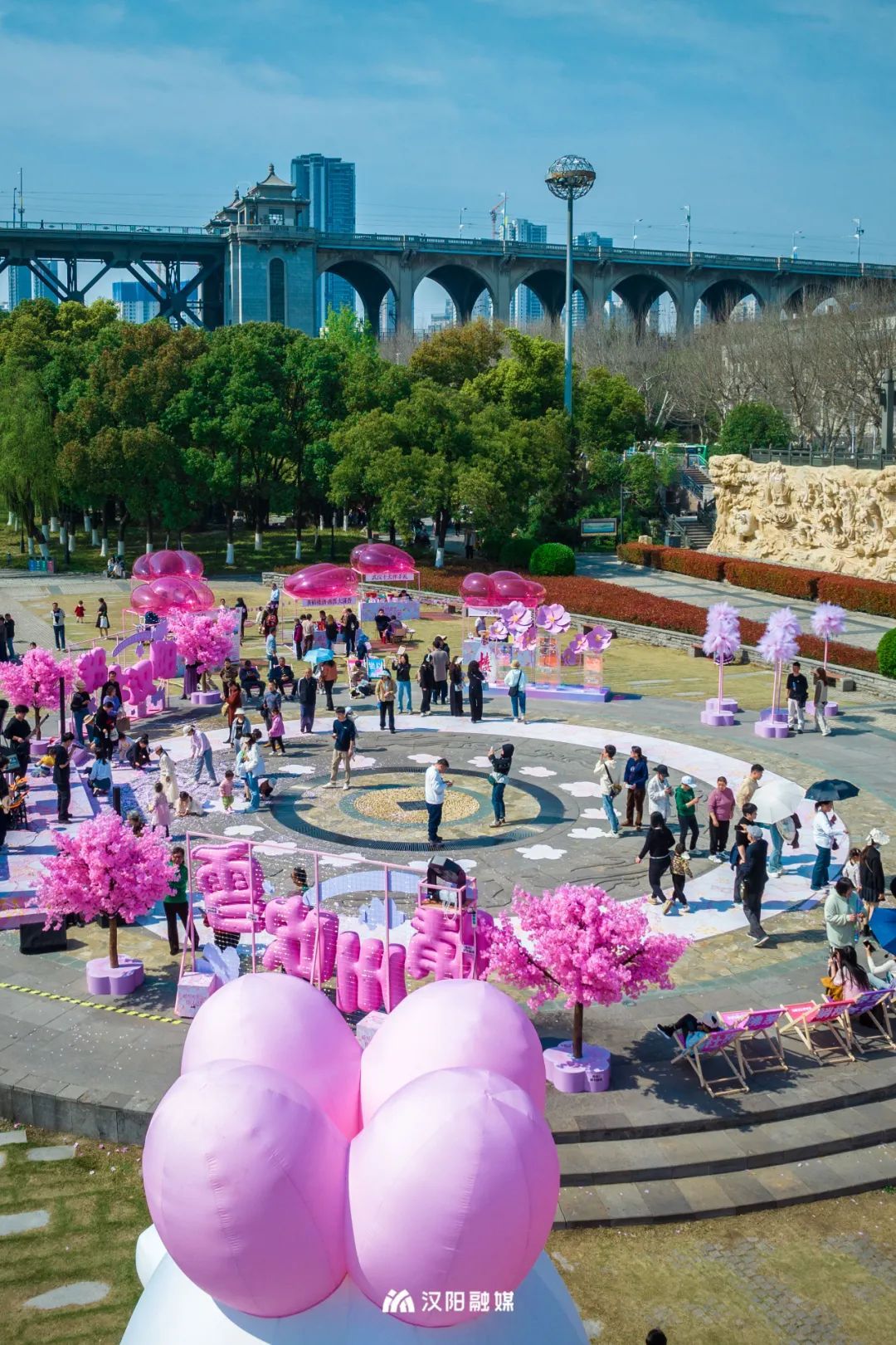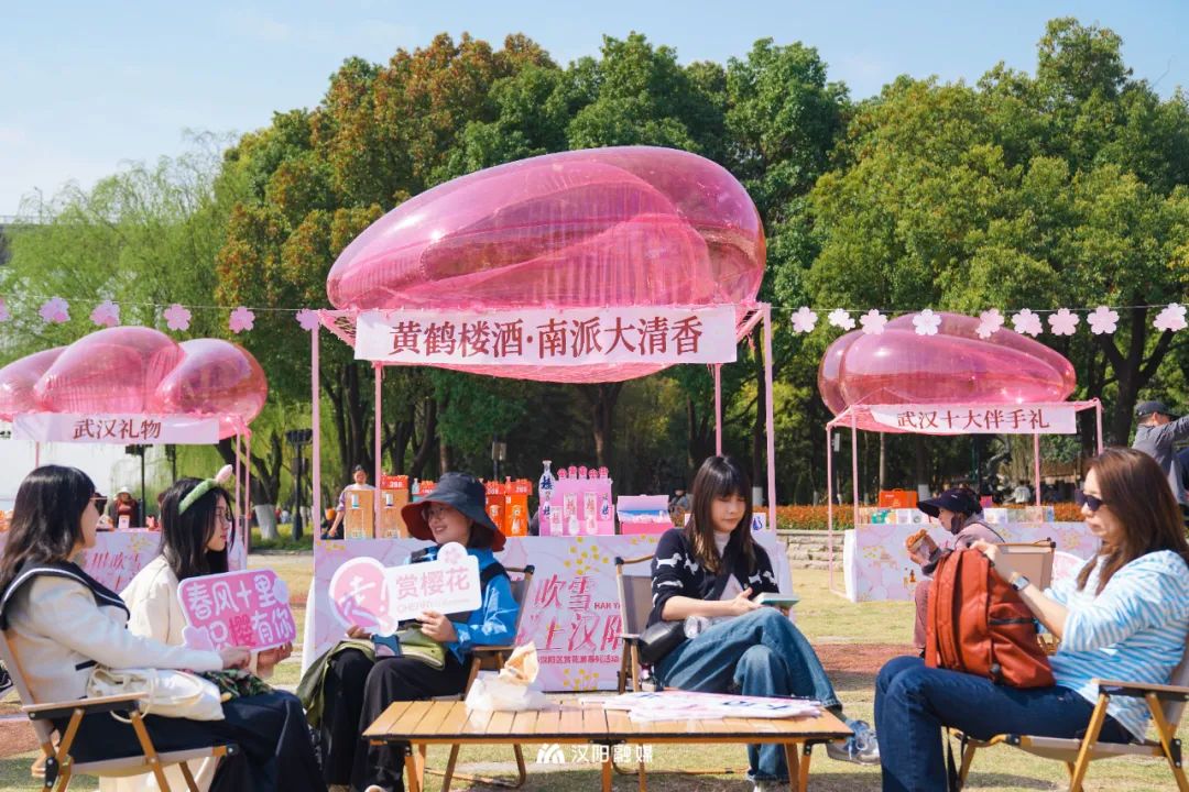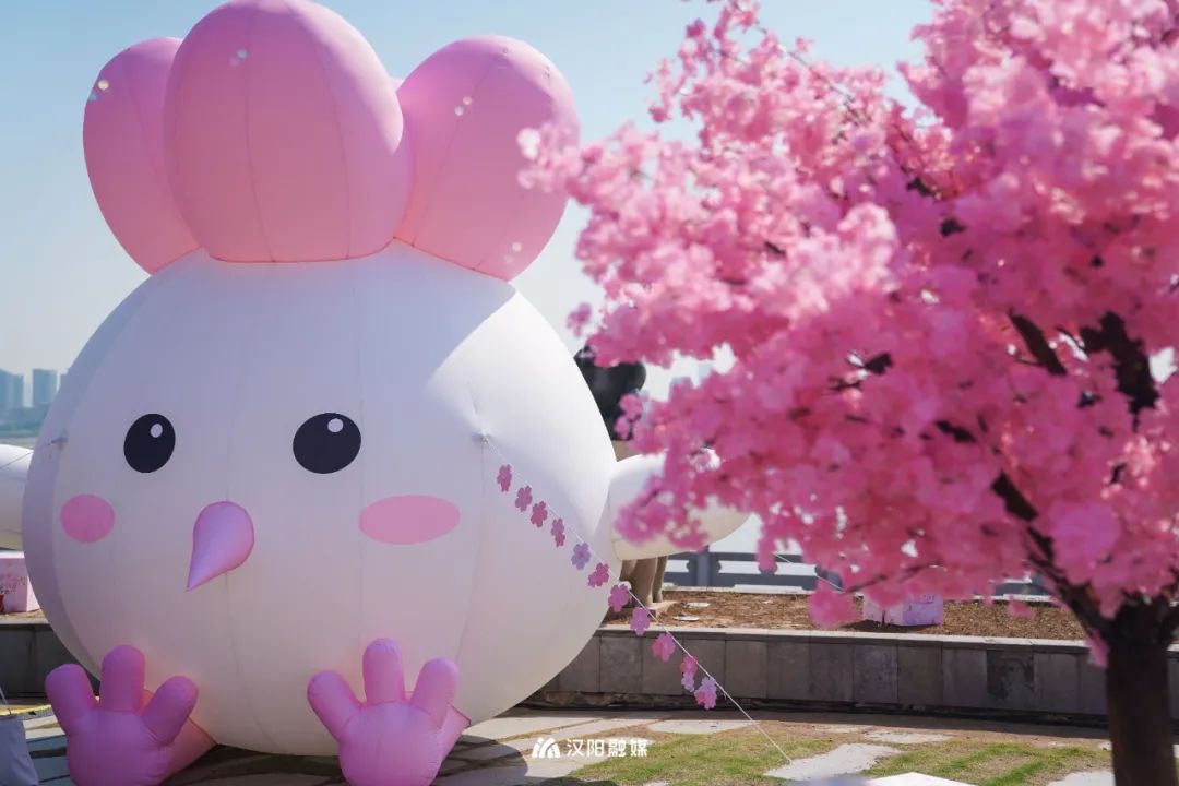 舞台旁,粉色云朵气模等限定款互动美陈,格外出片;露营椅沿着舞台排开,现场氛围浪漫而温馨;仿真樱花树轻松俘获你的芳心,好看又好玩。粉上汉阳,原来真的和呼吸一样简单。