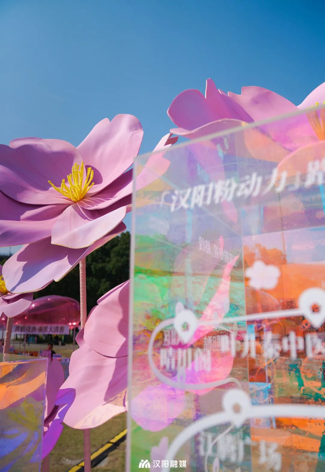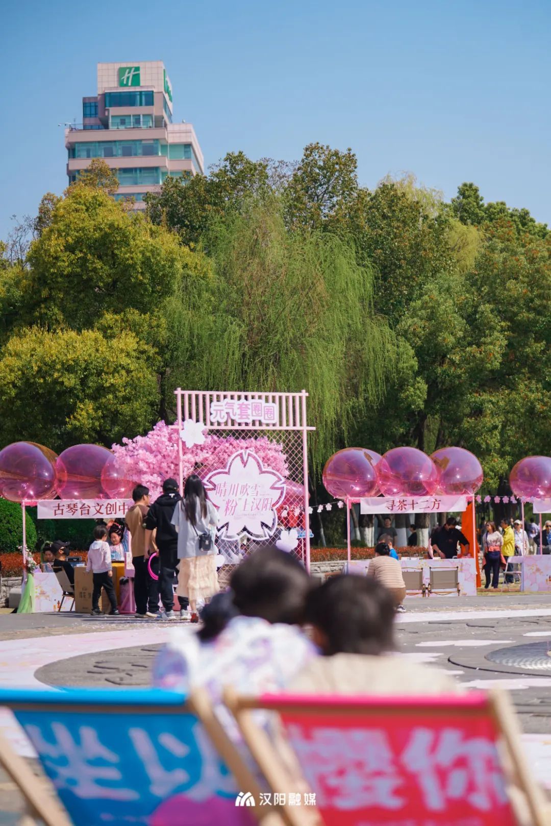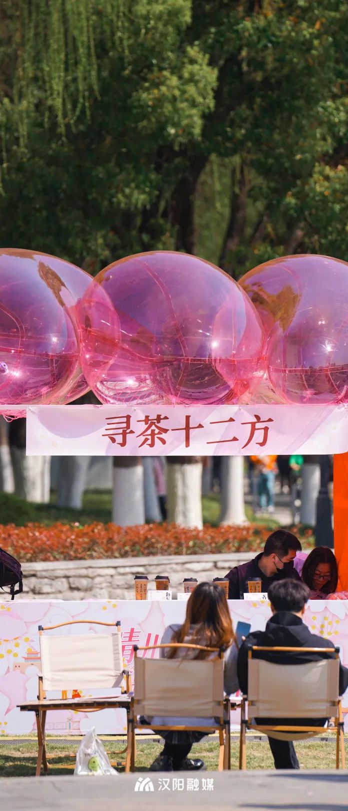 舞台旁,粉色云朵气模等限定款互动美陈,格外出片;露营椅沿着舞台排开,现场氛围浪漫而温馨;仿真樱花树轻松俘获你的芳心,好看又好玩。粉上汉阳,原来真的和呼吸一样简单。