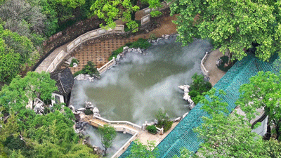 平台之下的水池区域,又是一处古风打卡点。仙雾缭绕,如临仙境,小桥流水,石山亭榭,一步一景皆是意境。
