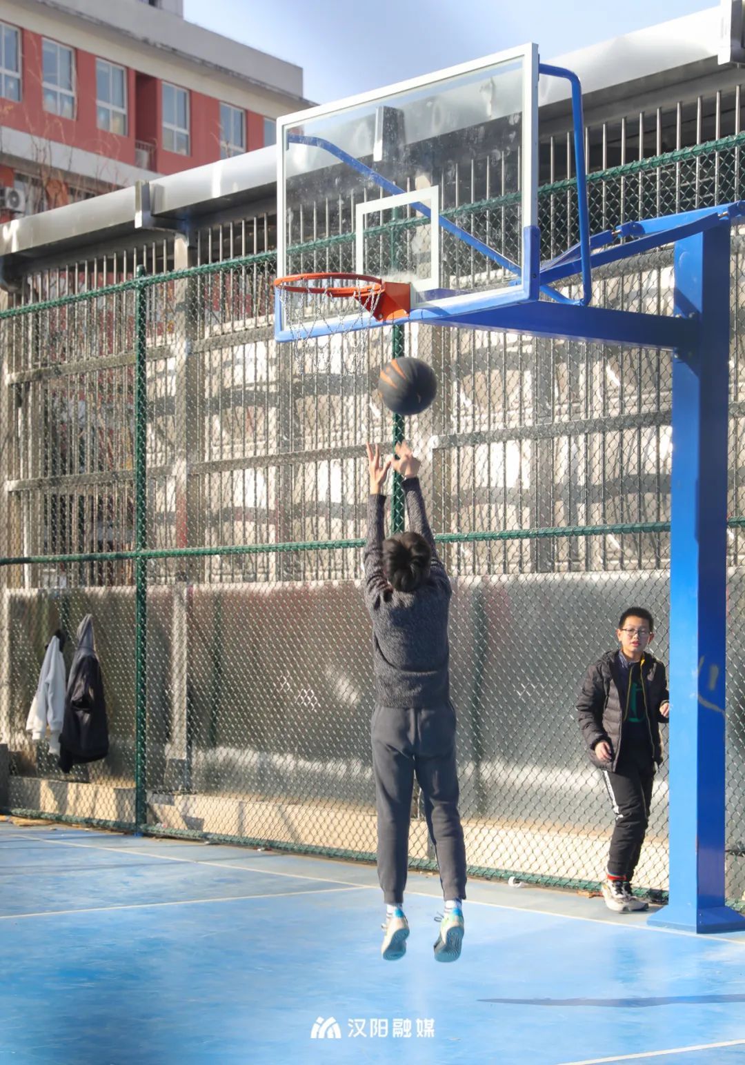 在综合停车楼现场可以看到,外围被建成了开放的口袋体育公园,与知音小学相隔一条马路。园内配套了休闲设施,长达967米的蓝色环形步道蜿蜒其中,广场东北侧建设了一处240平方米的灯光篮球场,几名年轻人正在打篮球。