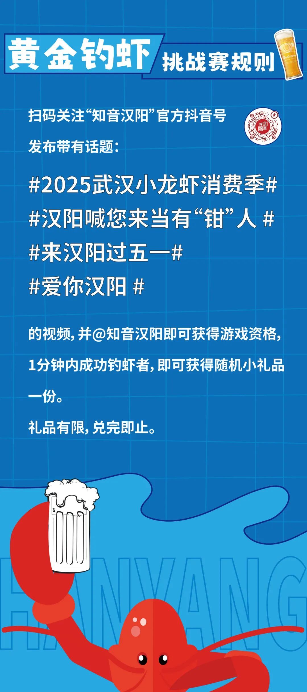 汉阳君将扛着自拍杆闪现龙阳湖东路+玫瑰街,边走边嘬油焖虾,弹幕刷“汉阳小龙虾,有钳任性”,直播间狂送龙虾霸王餐!(主播嘬虾速度可能破吉尼斯,每家店停留时间有限,抢福利手慢无!)