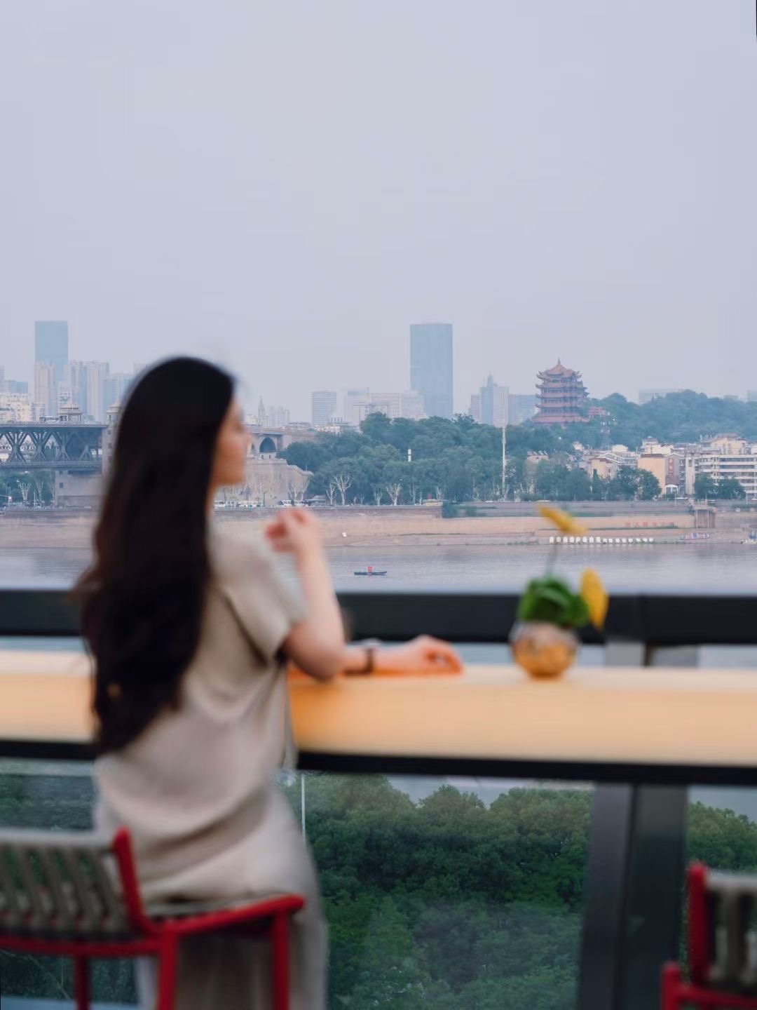登上四楼,全景巨幕落地窗,人在半空,心旌摇荡。再上顶楼,270度观景平台,绝佳视野,武汉四大地标一览无遗——