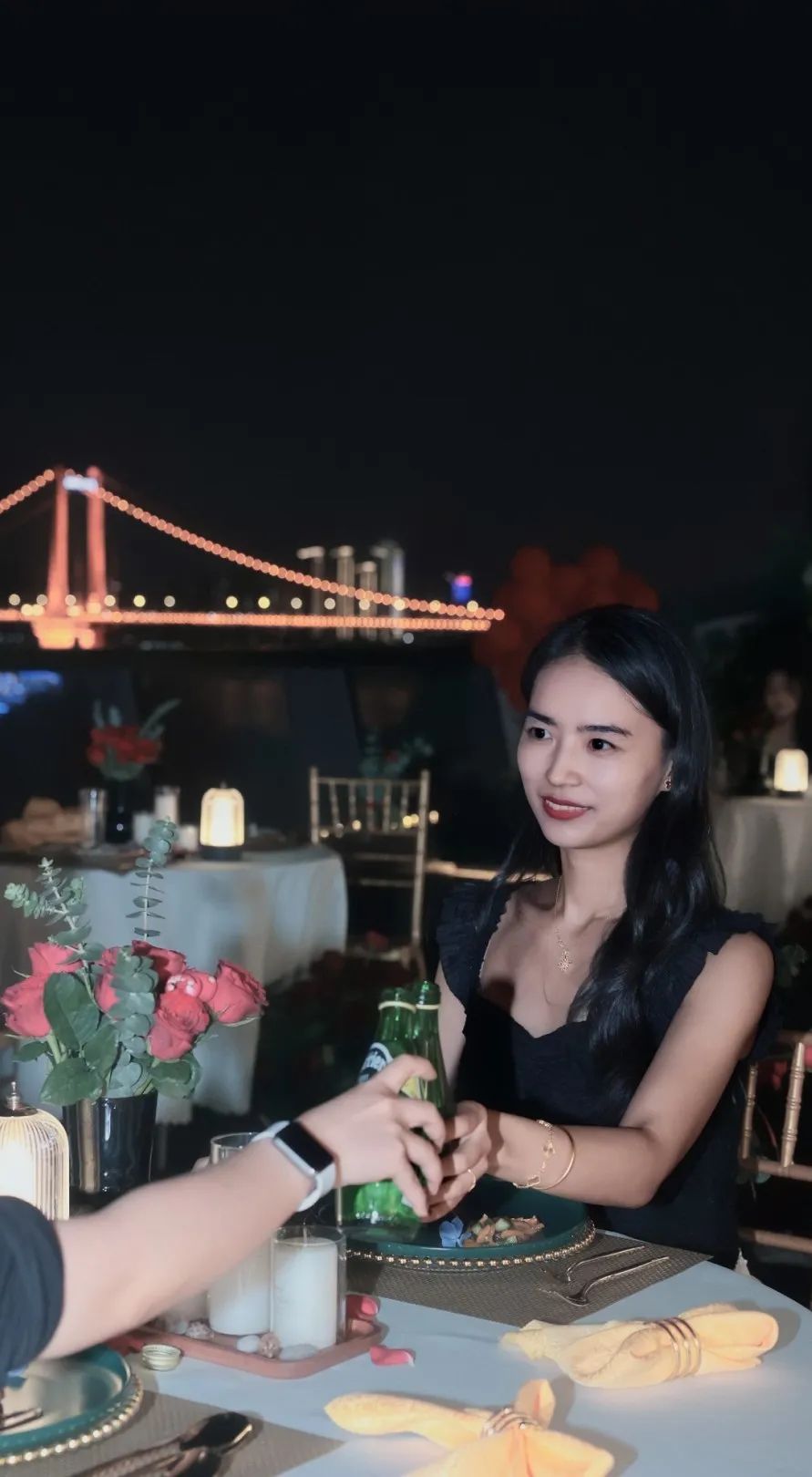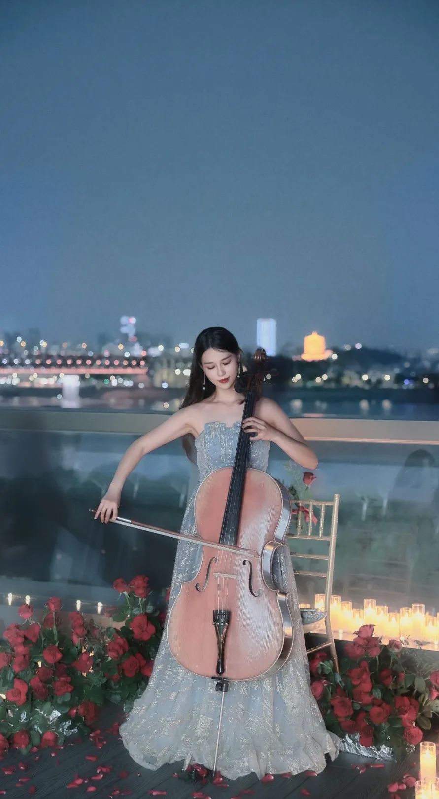 参加烛光音乐晚餐的市民,身旁有小提琴手优雅地拉动琴弦,身后是璀璨夺目的城市夜景。大家纷纷举起手机与这绮丽的景色合影打卡。现场还有专业摄影师,免费为大家拍摄写真,以江为景,以夜色为幕,与江城地标同框。