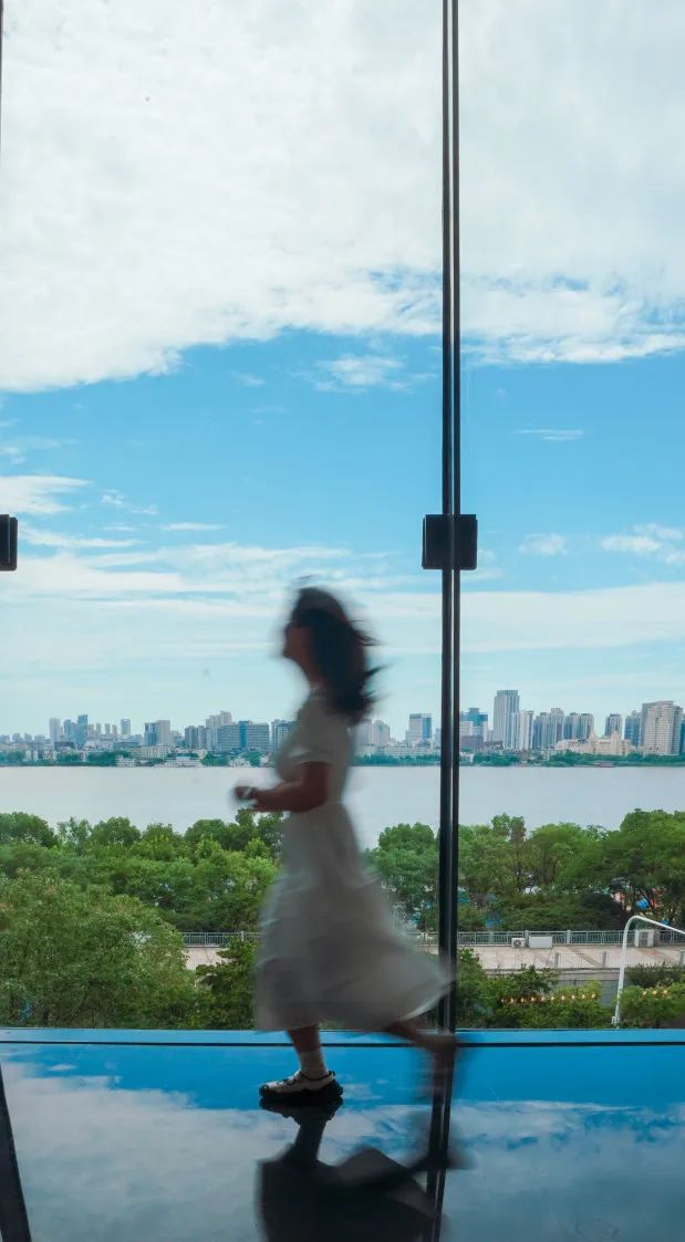 登上四楼,全景巨幕落地窗,伫立在落地玻璃前,仿佛与整个浩瀚城市紧密相连。比个心,就能把江对面的黄鹤楼框起来。