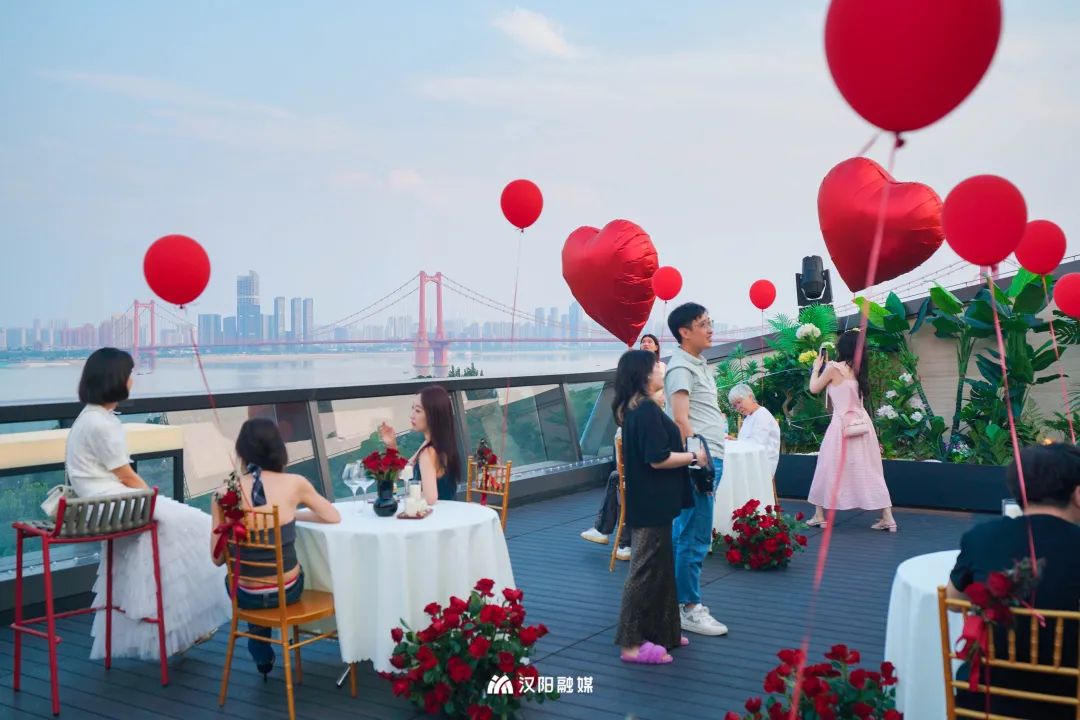 活动现场,「武汉之眼」5楼城市天台,用蜡烛、玫瑰花、气球等精心布置的浪漫空间,在夜色的包裹中绽放着独特的魅力。