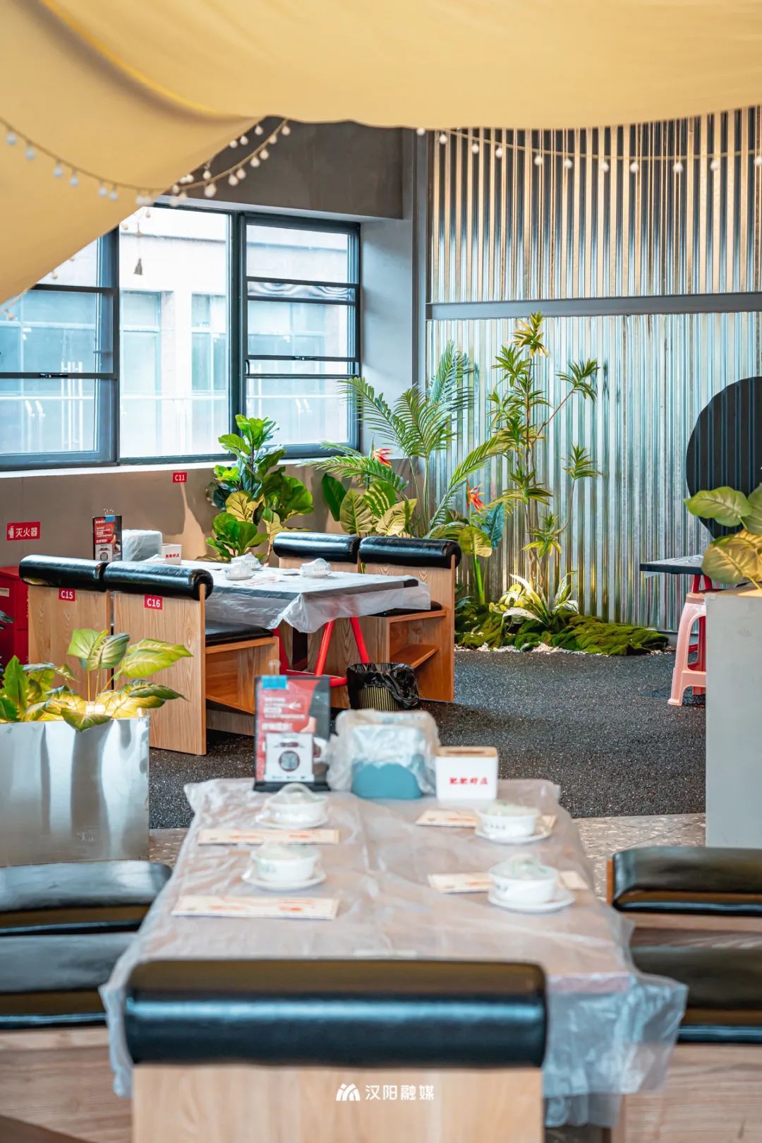 天幕帐篷、碎石绿植、矮桌与木凳,肥肥虾庄国博露营店营造出惬意放松的嘬虾氛围。