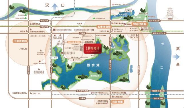 作为二环内少有的一线滨湖纯改善公园住区,南侧为约24.8公里的环湖绿道,串联起6168亩墨水湖公园;坐拥五里墩、王家湾、钟家村三大城市级商圈;五里墩小学、武汉第二十三中学等多所学校分布项目周围;汇聚汉阳医院、武汉亚心总医院、泰康同济医院等医疗资源。繁华与静谧在此共生。