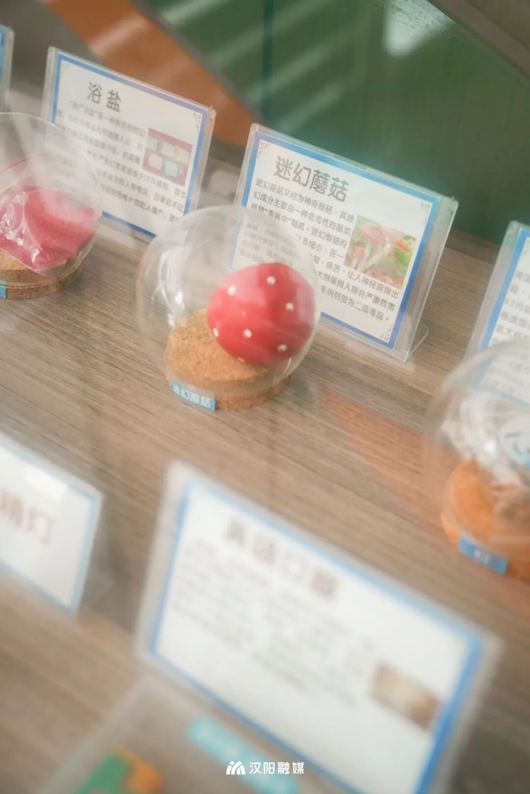△玻璃展示柜中摆放了可卡因、摇头丸、快乐水等常见毒品仿真模型及图文介绍。