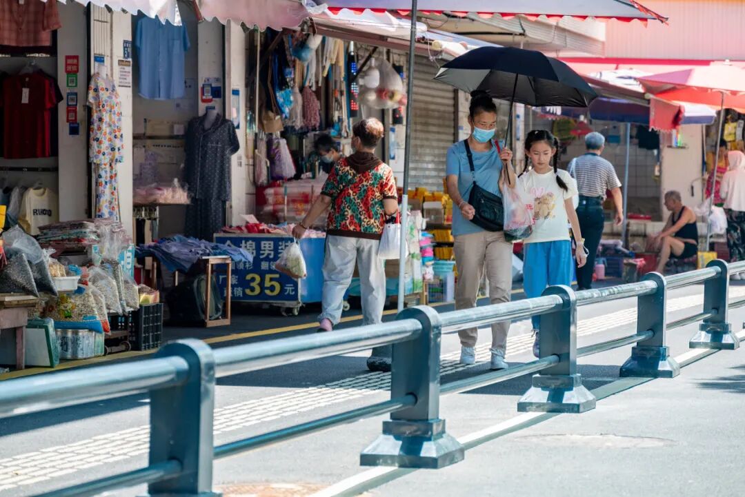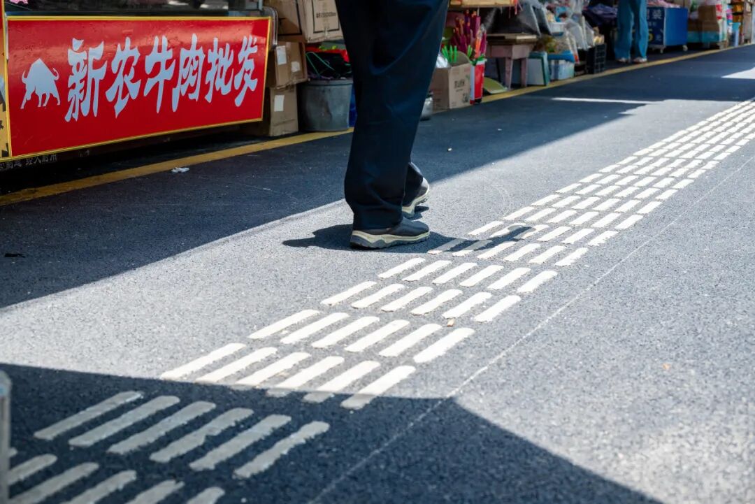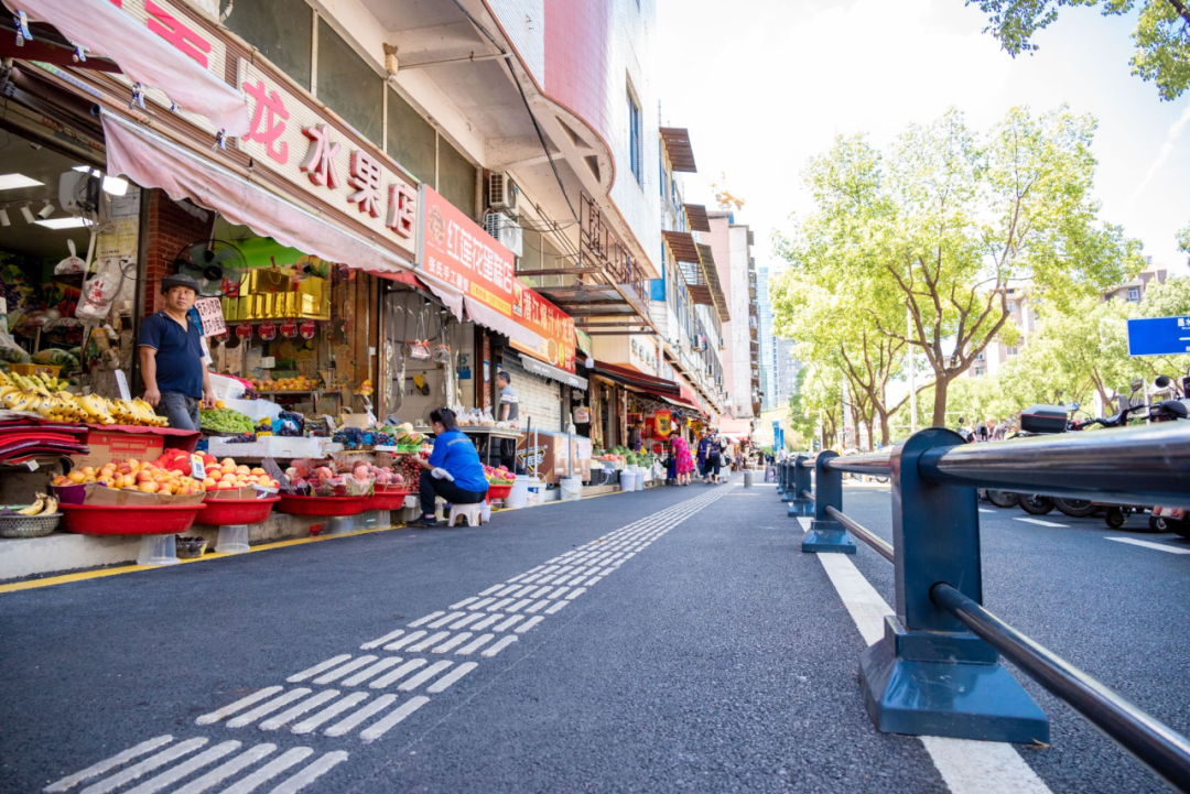 人行道则换掉步砖,铺上平整、防滑的沥青路面(改造面积约1880平方米),配上117米长的新的站石,不用担心雨天来买菜会“踩水洼”。同时,在人行道范围内装上了约370米长的分隔护栏,实现了“人车分流、机非分流”,走路也更安全。