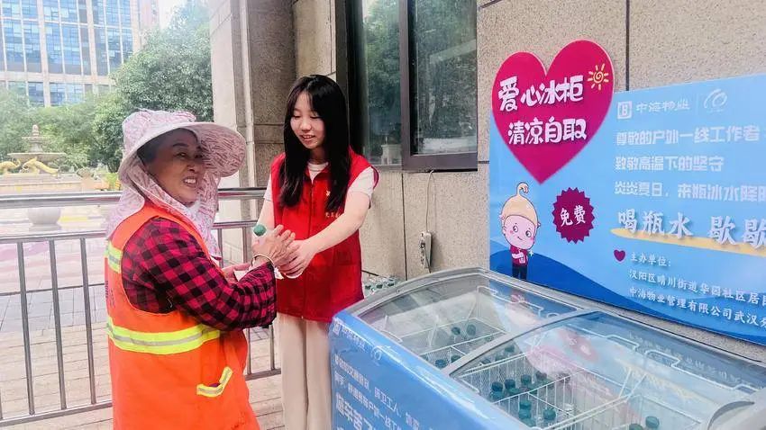 △晴川街道华园社区中海琴台华府小区西门出入口设立爱心冰柜,志愿者为户外工作者送矿泉水。