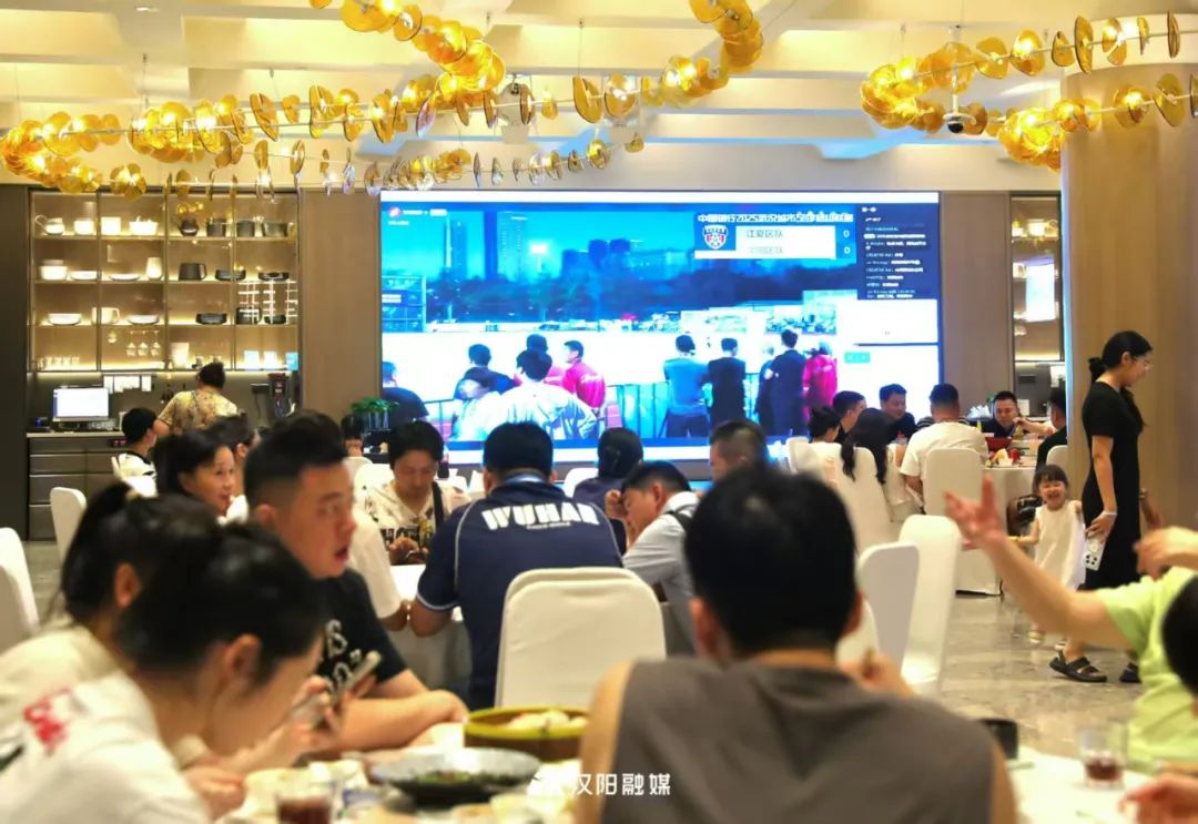 东鑫酒店食客一边就餐一边观看比赛。大家目不转睛地盯着屏幕,时刻关注着汉阳队的表现。