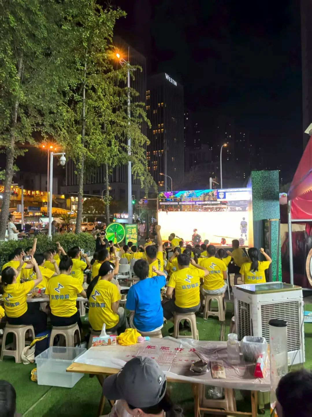 在龙阳湖东路美食街,球迷朋友们自发的统一服装,在大屏下观看比赛,为汉阳队加油助威。
