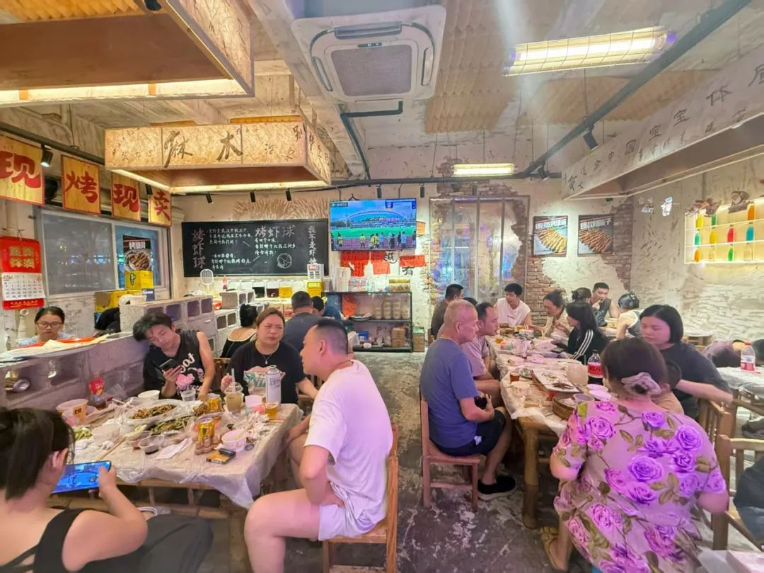 在江堤中路,食客一边撸串,一边看球,夏日激情拉满。
