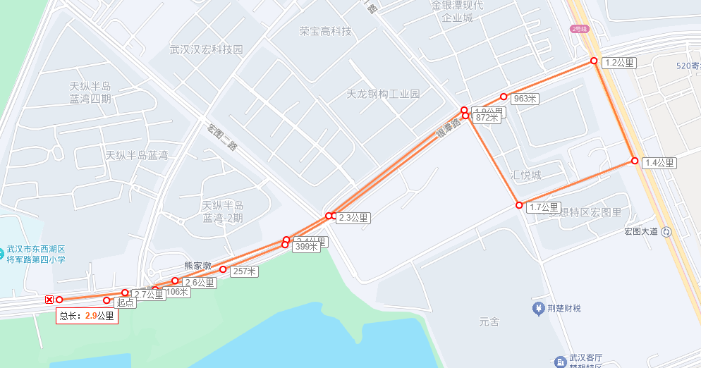 线路走向:由天纵·半岛蓝湾1期南门发车,经银潭路、宏图路、居家路、宏图一路、银潭路至天纵·半岛蓝湾1期南门,全程线长3公里。
