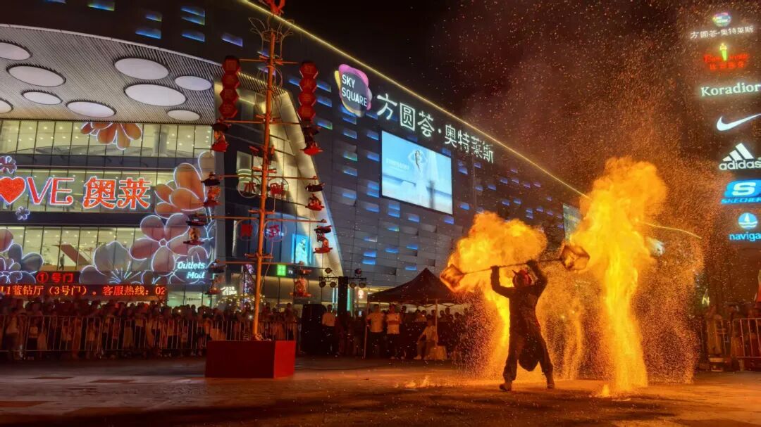 △方圆荟·奥特莱斯非遗烟火大秀引民众围观。
