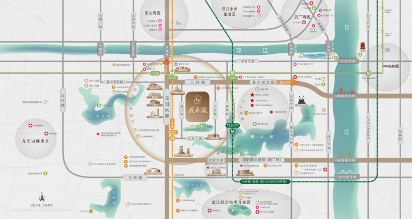 由汉阳城更匠心打造的花木深项目,择址在王家湾正二环,紧临2环线、地铁3号线、4号线和在建的12号线,步行即达王家湾商圈——汇聚人信汇、摩尔城、汉商21世纪、京东Mall(预计2026年上半年开业)等大型商业体。门口紧邻市政公园,步行约350米即可达约411公顷的墨水湖公园,可享受湖园双栖生活。