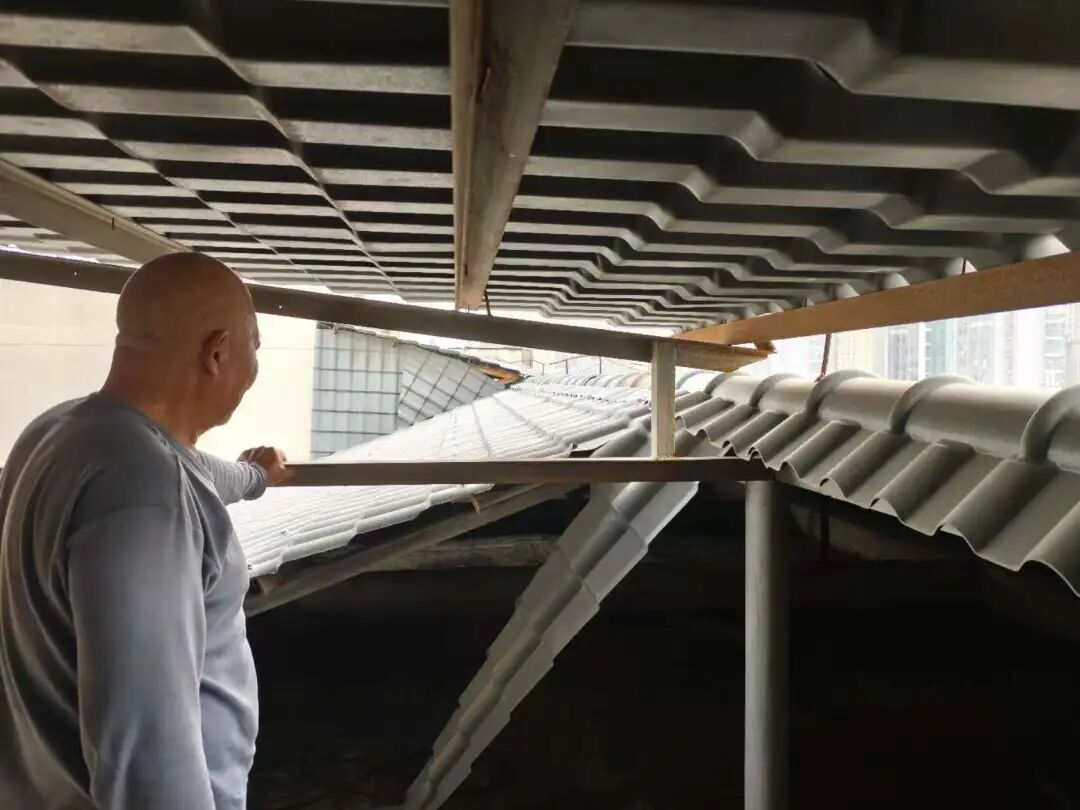 △周重书在顶楼为龚爹爹家屋顶渗水排查原因。