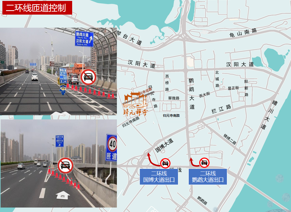 核心区域路段:2月16日(除夕)22:00至17日(初一)18:00、2月20日(初四)22:00至21日(初五)18:00,归元寺路、西桥路、翠微路、归元寺北路、归元寺南路、肖家湾路禁止机动车及非机动车通行和停放。