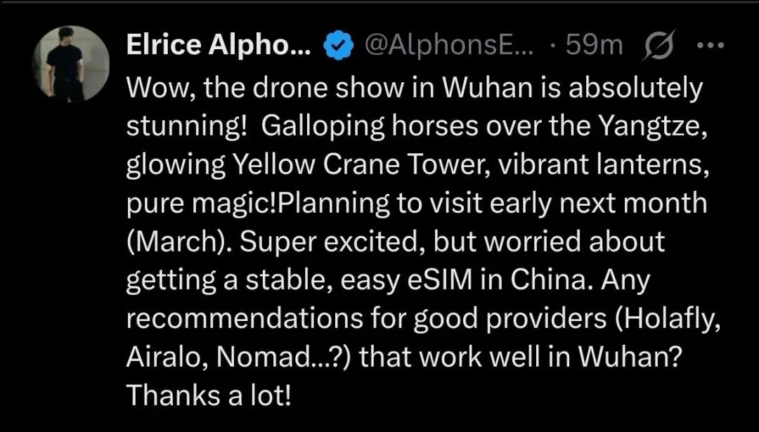 网友:哇,武汉的无人机表演简直太震撼了!骏马奔腾于长江之上,黄鹤楼流光溢彩,花灯璀璨——仿佛置身梦幻之境!我计划下月(3月)初去武汉旅游,超级期待,同时也担心在中国办理稳定好用的eSIM会遇到困难。请问能不能推荐在武汉比较好用的服务商(比如Holafly、Airalo、Nomad等)?非常感谢!