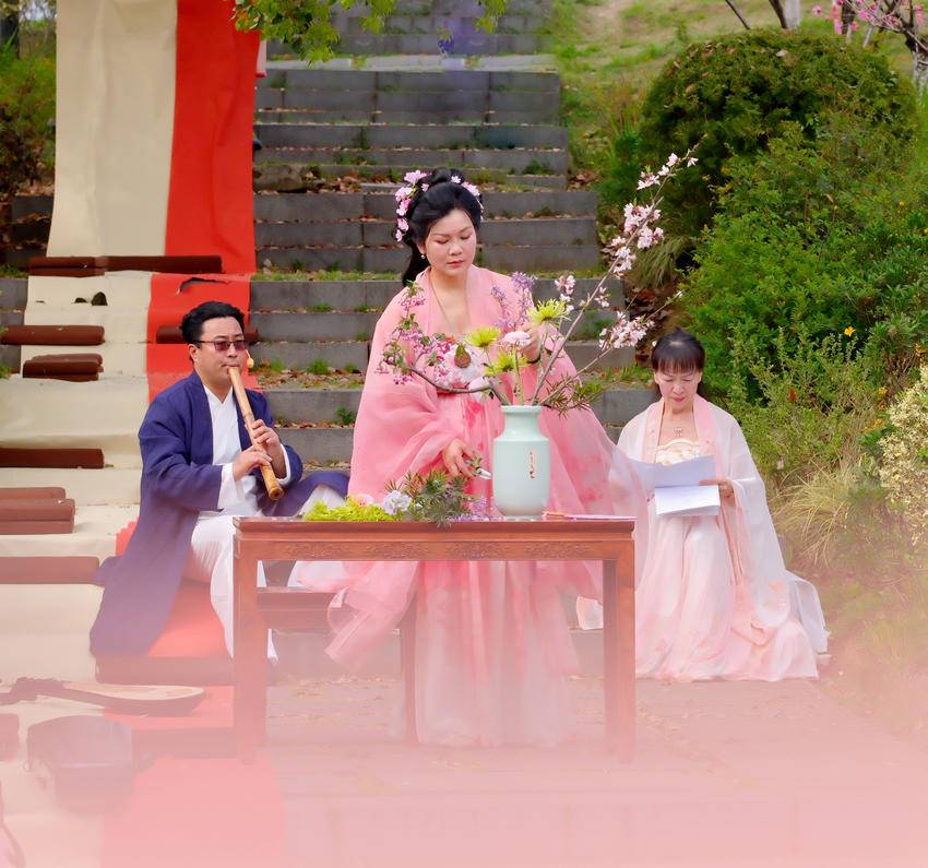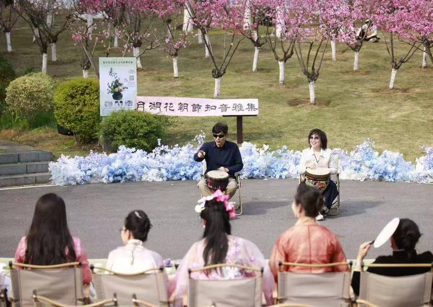 雅集非遗知音花艺代表性传承人柯杏林介绍,今年花朝节(俗称“花神节”“百花生日”“花神生日”,是汉族传统节日八节之一)是3月29日,三月正是桃花夫人息夫人当值,月湖风景区周边又有息夫人传说的核心遗址地——桃花夫人庙与桃花洞,而其园花正是桃花。因此,选择在月湖开展活动很契合主题。